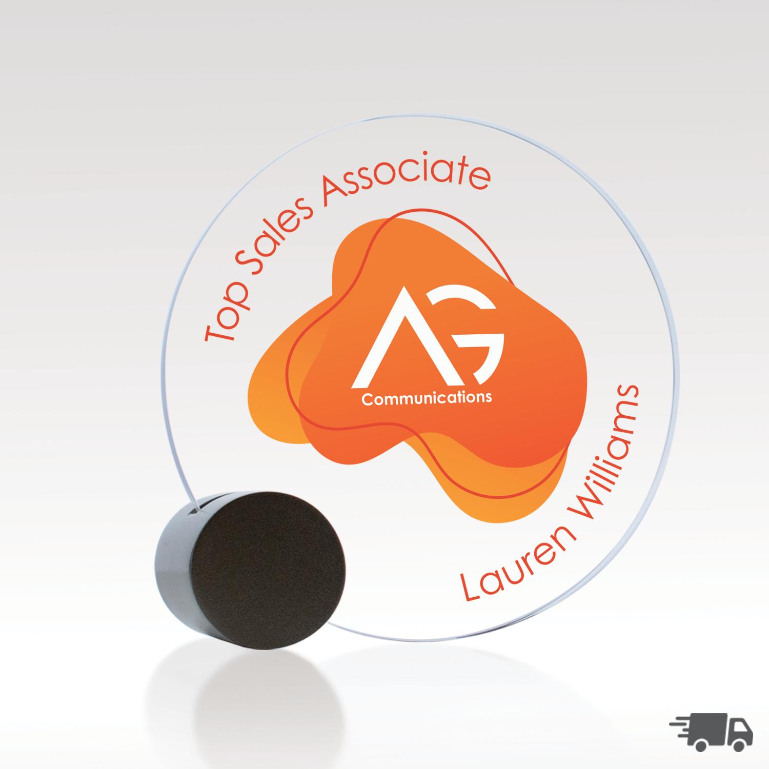 The Silver Geo is a fun and fashionable award all the way around. Digital color on the acrylic disc adds a vivid pop while the silver cast cylindrical base adds a touch of bling.